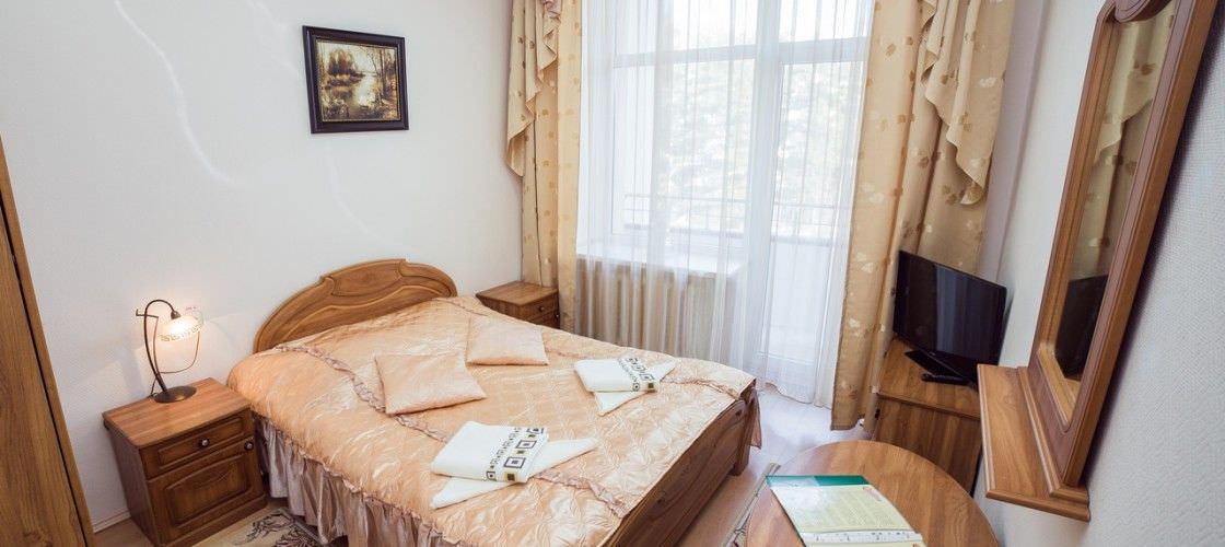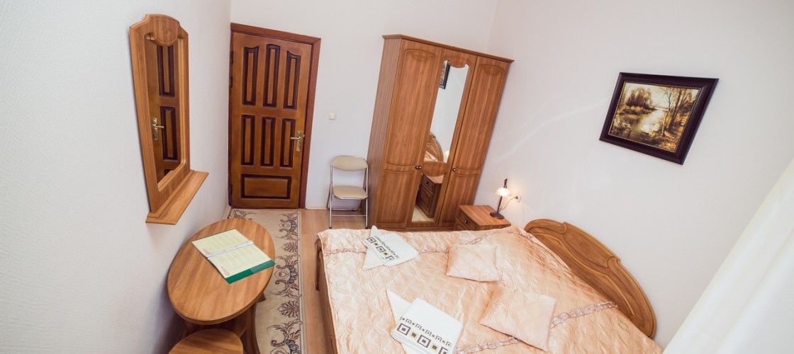 1 осн. место. 1 доп. место. Мебель: вешалка, зеркало, кровать двуспальная, прикроватные тумбочки, стол, стулья, шкаф. Оборудование: набор посуды, телевизор, утюг, холодильник, электрочайник. Санузел: с душевой кабиной, туалетные принадлежности. Сервис: Wi-Fi бесплатно, смена полотенец, смена постельного белья, уборка номера.